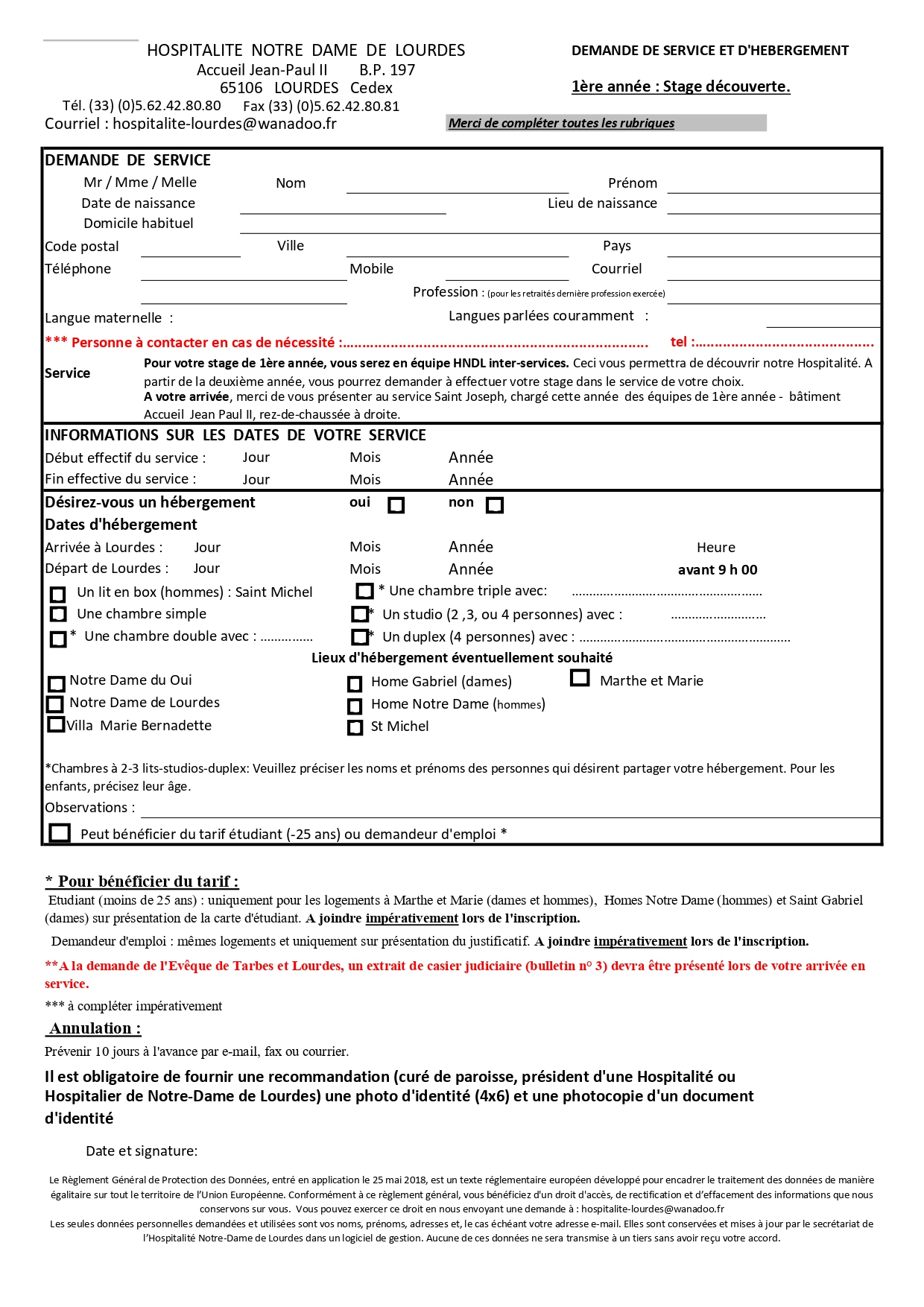 ATTENTION : **A la demande de l'Evêque de Tarbes et Lourdes, un extrait de casier judiciaire (bulletin n° 3) devra être présenté lors de votre arrivée en service.Pour bénéficier du tarif :Etudiant (moins de 25 ans) : uniquement pour les logements à l'Hospitalet (dames et hommes), Homes Notre Dame (hommes) et Saint Gabriel (dames) sur présentation de la carte d'étudiant. A joindre impérativement lors de l'inscription. Demandeur d'emploi : mêmes logements et uniquement sur présentation du justificatif. A joindre impérativement lors de l'inscription. Annulation : Prévenir 10 jours à l'avance par e-mail, fax ou courrier ATTENTION Il est obligatoire de fournir une recommandation (curé de paroisse, président d'une Hospitalité ou Hospitalier de Notre-Dame de Lourdes) une photo d'identité (4x6) et une photocopie d'un document d'identitéVous pouvez aussi utiliser le formulaire papier en cliquant ici